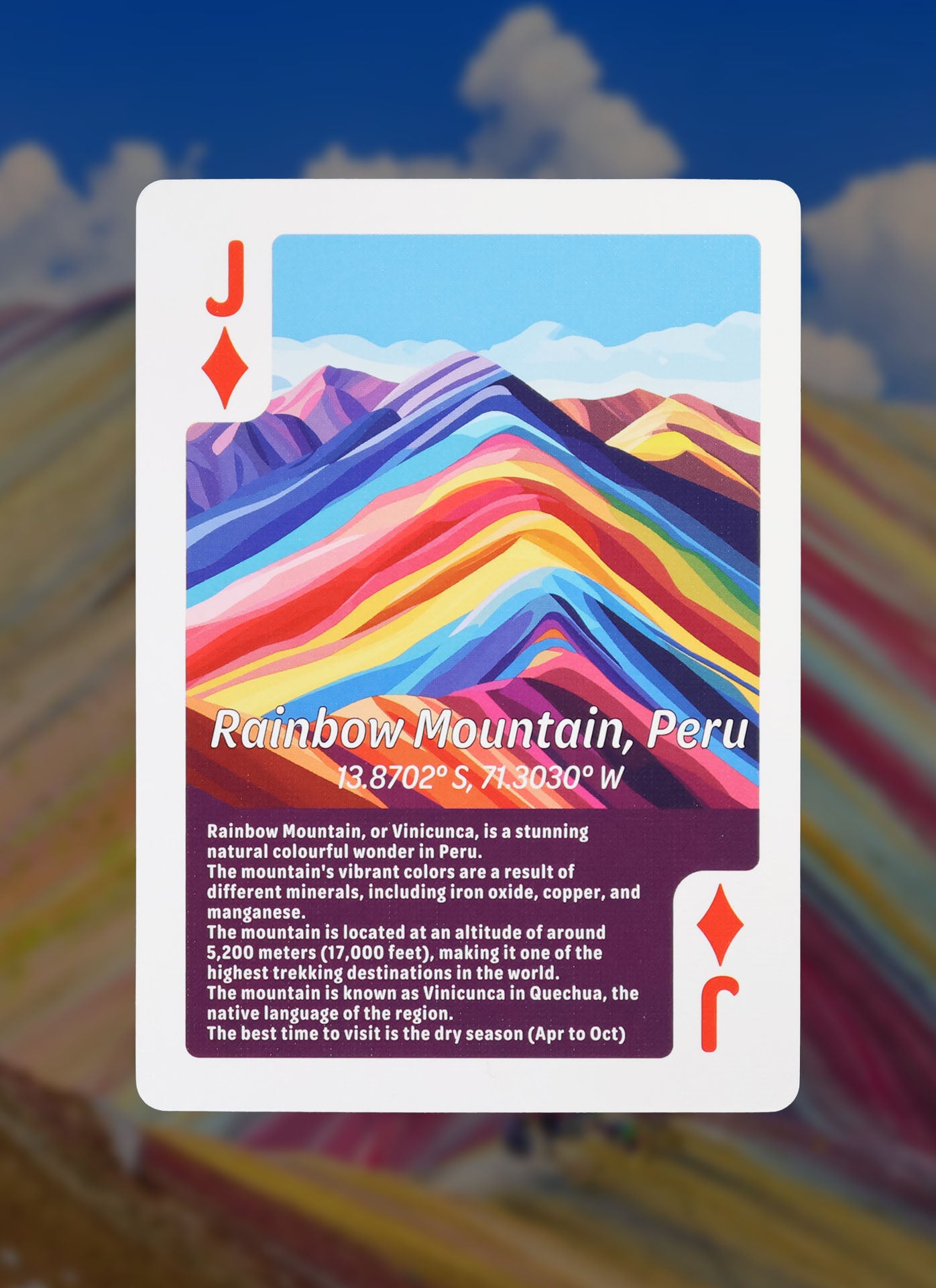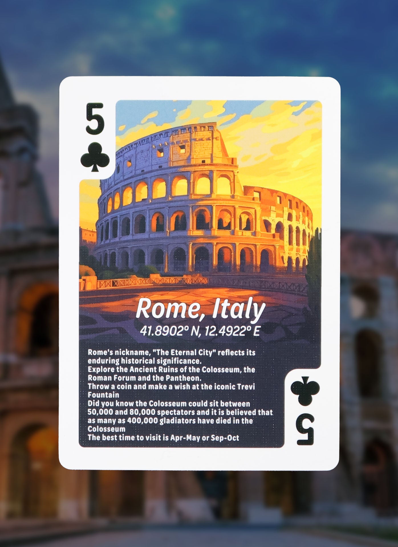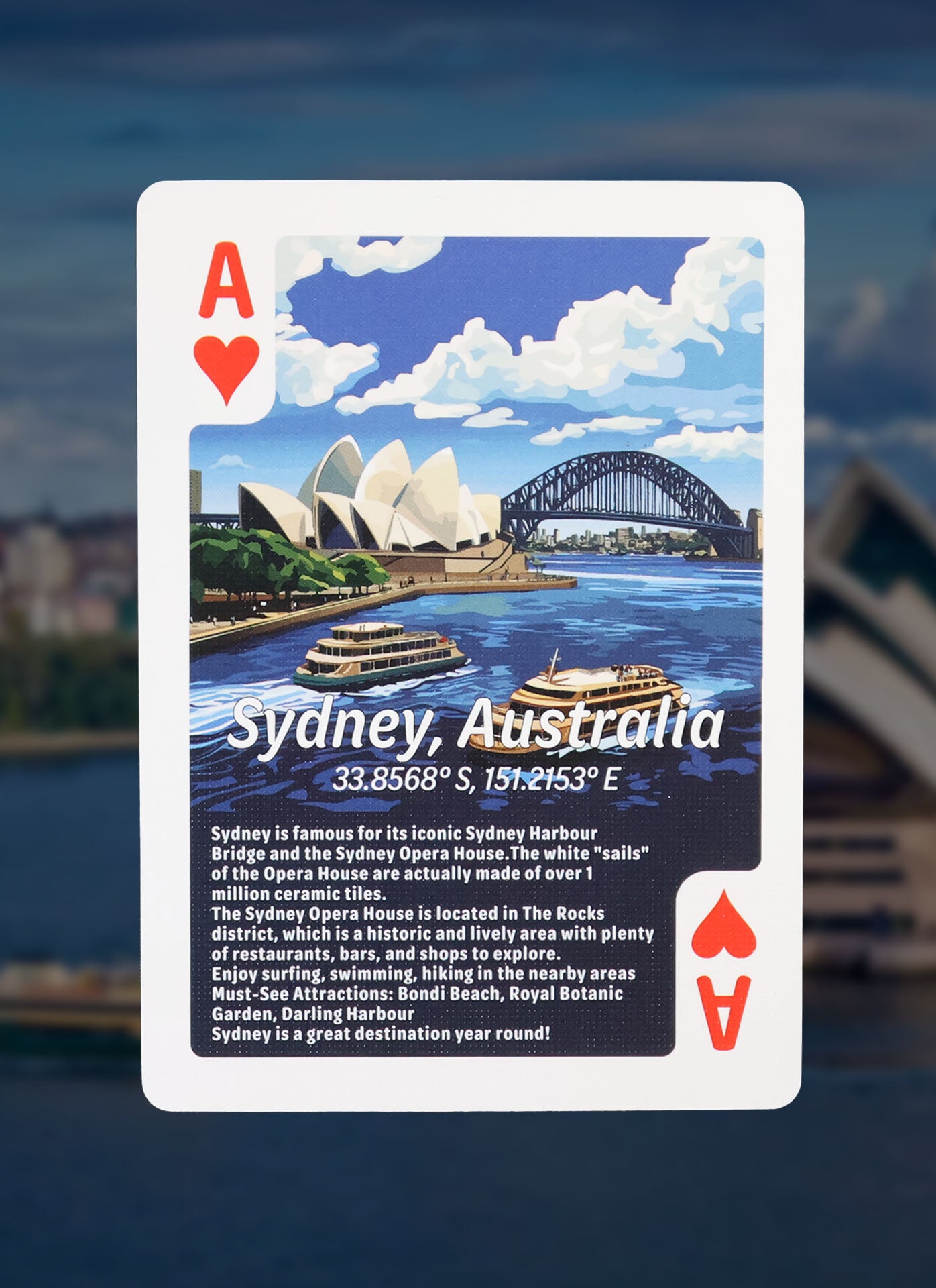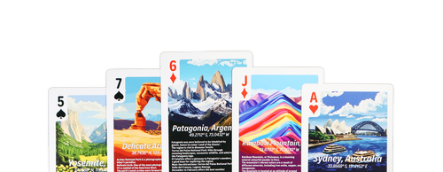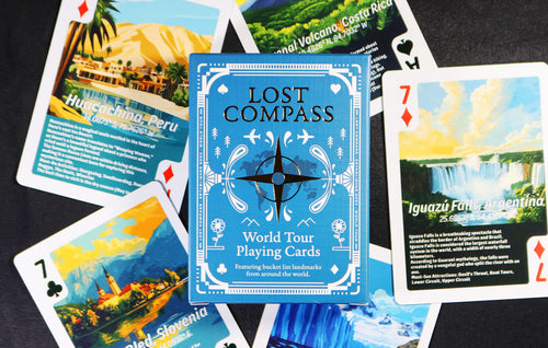 In a hostel, out with mates or simply bored at the airport? Our world tour playing cards are a must have for travelling, featuring unique travel tips for 52 destinations!
